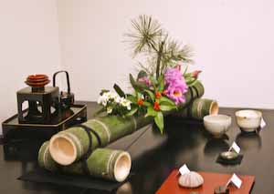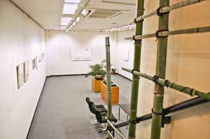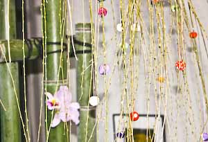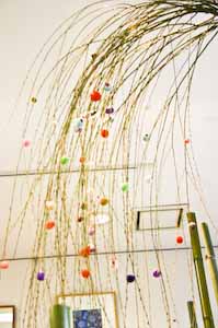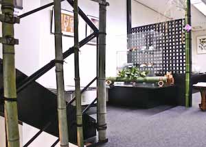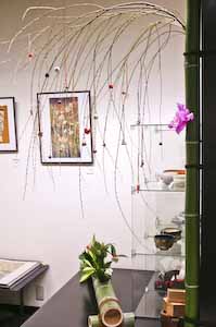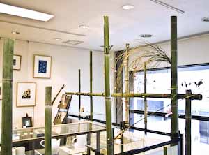 画廊正面の 大きなガラス越しに見る 花飾り 右側に見えている スペースが 半地下の展示室です。