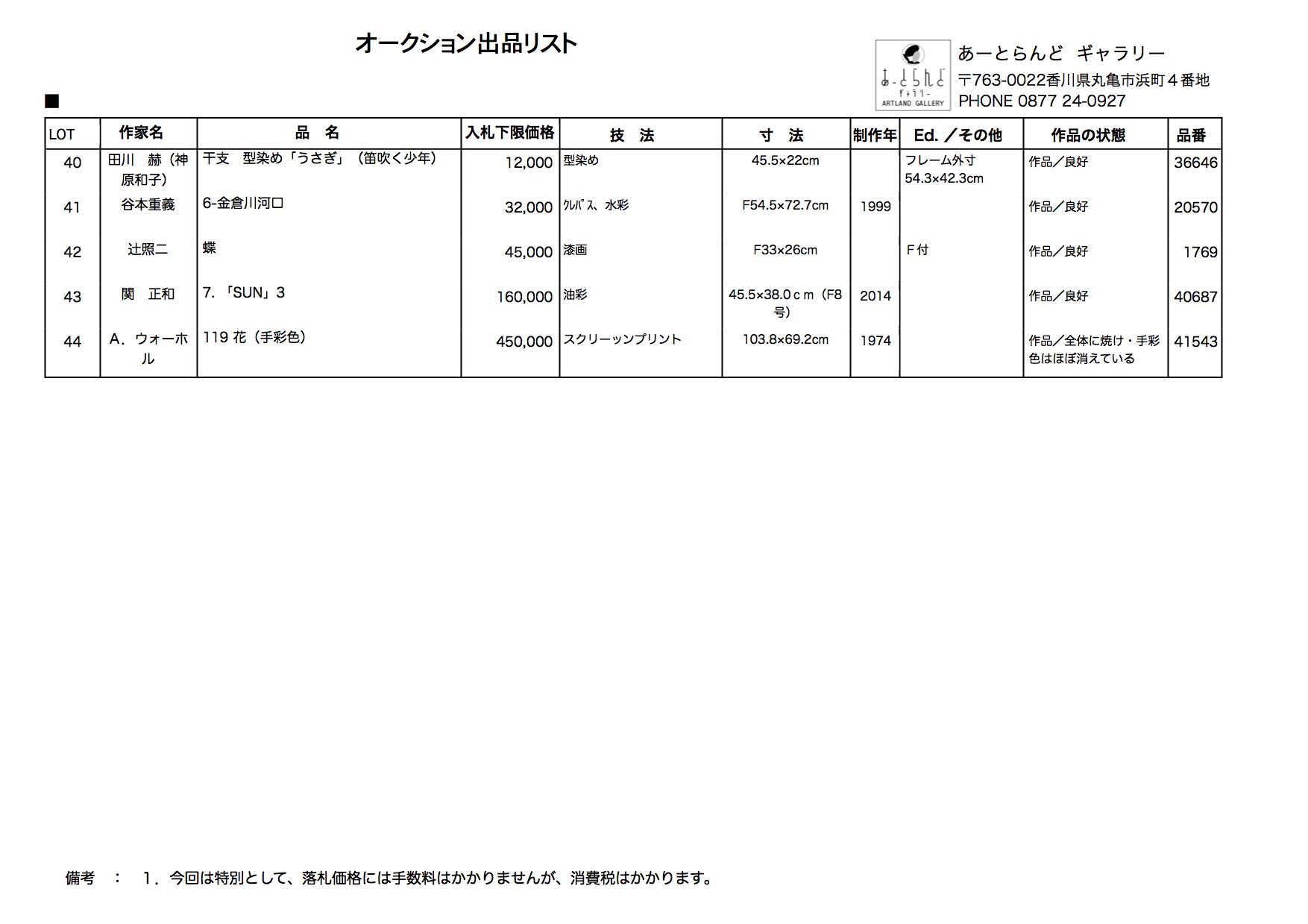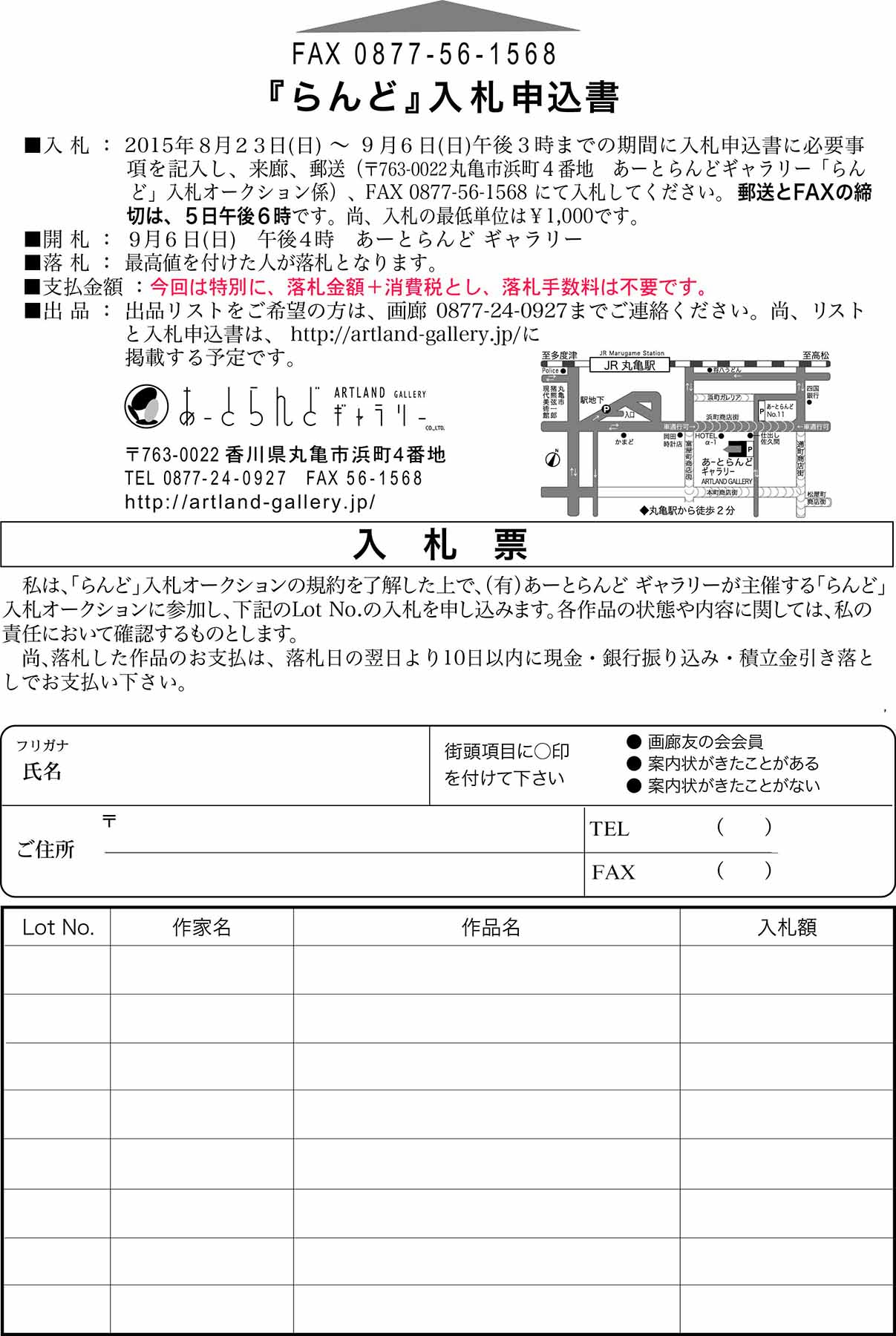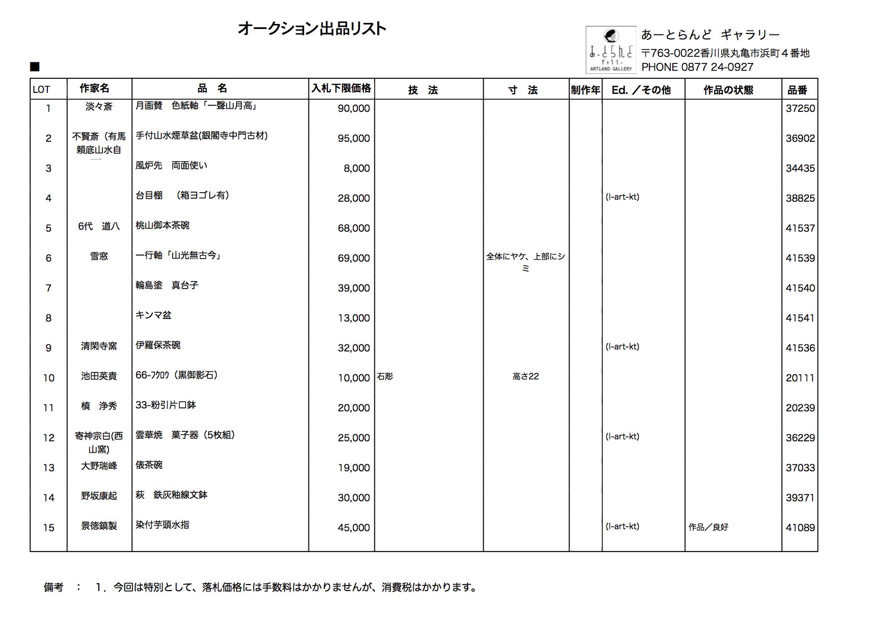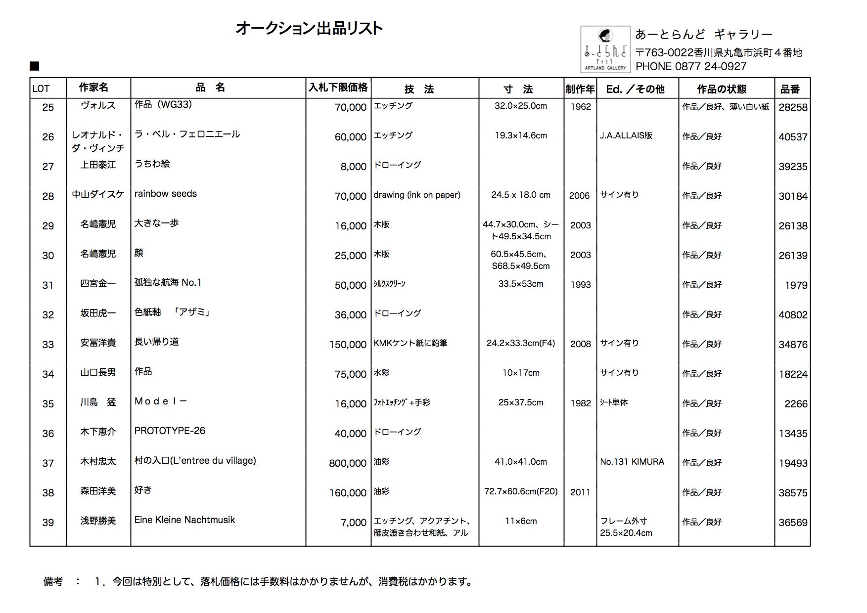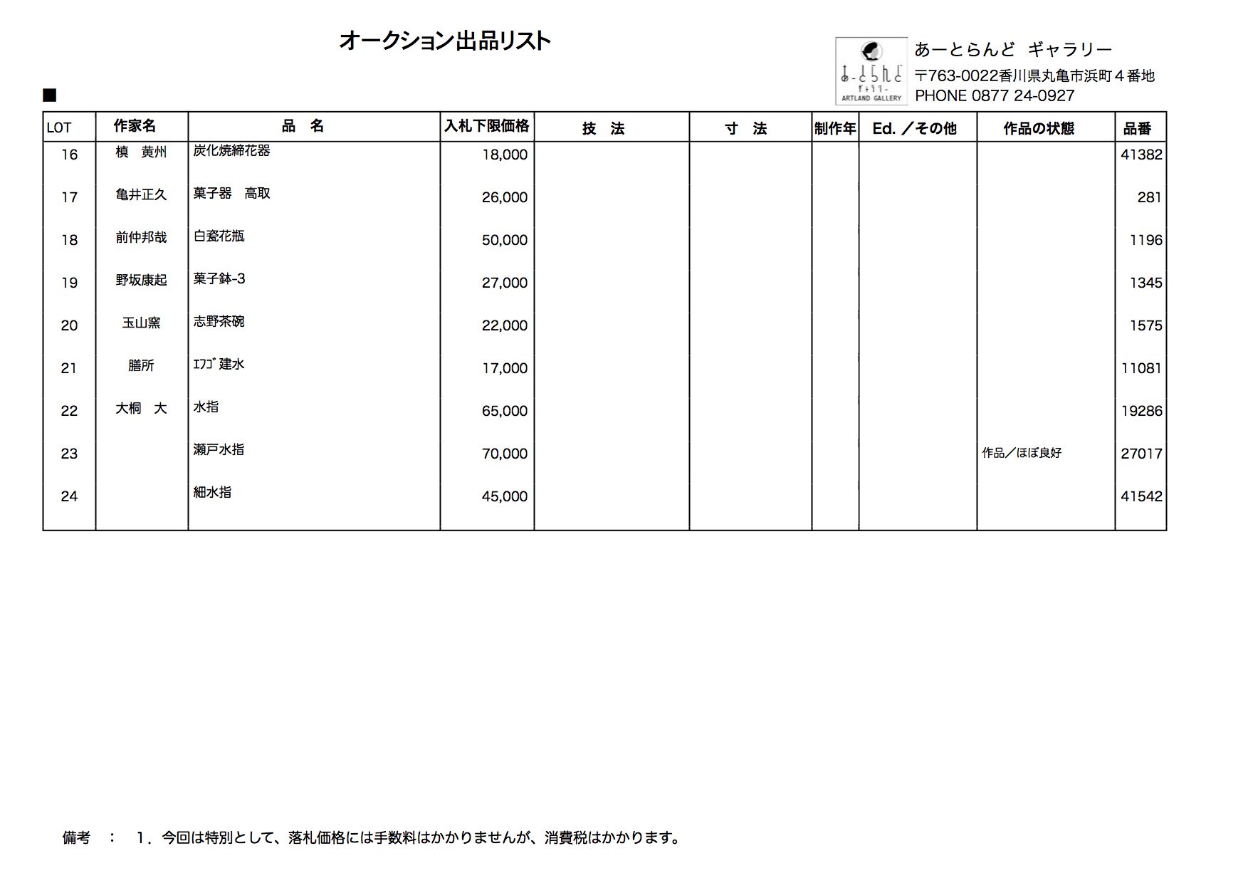 <特別イベント> 「らんど」入札オークション 画廊コレクションの中よりおすすめの絵画、工芸作品、茶道具の入札オークション です。 ■入 札:8月23日(日)〜9月6日(日)午後3時まで ■開 札:9月6日(日) 午後4時 ■会 場:あーとらんど ギャラリー ■入札方式: 入札票に記入 ■入札方法:来廊にて入札票を投票するか、入札票を郵送、もしくは、FAX (0877- 56-1568)下さい。郵送およびFAXの期限は、12日午後6時です。 尚、入札票は、下記をクリックして印刷して下さい。 ▼入札票(FAX用)ダウンロード ■入札票 ■落 札:最高値を付けた人が落札となります。 尚、今回は特別に、落札金額+消費税とし、落札手数料は不要です。 ■出 品:下記をごクリックして下さい 。 作品の状況は順次記入していきますが、詳細はお電話でお問合せ下さい。 0877-24-0927 担当;山下 ▼出品リスト ダウンロード ■リスト01 および リスト02(工芸・茶道具) ■リスト01 および リスト02(絵画・版画ほか) 画像、作品状態等のリストの作品に対するご質問は、 お気軽に電子メールにて お問合せ下さい。 E-mail :sales @artland-gallery.jp ■規 約:「らんど」入札オークションの規約は、下記をクリックして下さい。 「らんど」入札オークションの規約(落札手数料無料) 以上
