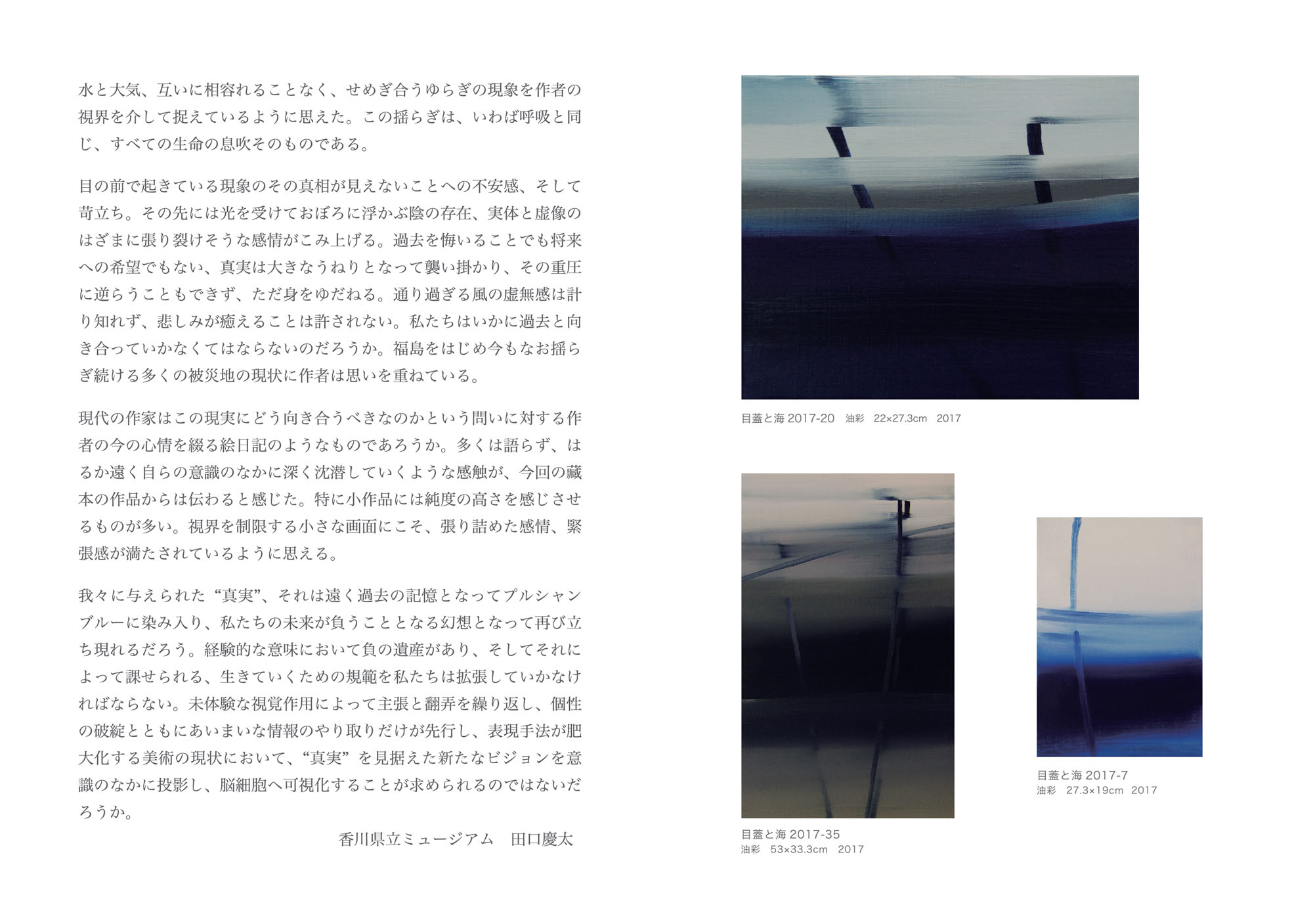 我々に与えられた“真実”、それは遠く過去の記憶となってプルシャンブルーに染み入り、私たちの未来が負うこととなる幻想となって再び立ち現れるだろう。経験的な意味において負の遺産があり、そしてそれによって課せられる、生きていくための規範を私たちは拡張していかなければならない。未体験な視覚作用によって主張と翻弄を繰り返し、個性の破綻とともにあいまいな情報のやり取りだけが先行し、表現手法が肥大化する美術の現状において、“真実”を見据えた新たなビジョンを意識のなかに投影し、脳細胞へ可視化することが求められるのではないだろうか。
