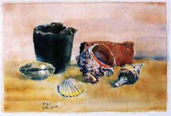 今回の個展の案内状に掲載される水彩画「花持てる少女」(添付写真)(56×38cm、2003)とは‥‥‥‥。