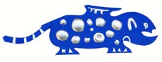 今回の展覧会では、木版に彫り出したをイメージを型押しに用いて、鳥、魚、ワニ、林檎、壷などや、曲線を多用した抽象図柄が30点ほど出品されます。それらの図柄には、金箔や銀箔を貼付けたり、ブルーやオレンジ等で鮮やかに彩色されたりと、本当に楽園に舞い込んだようなうきうきした気分が満載されています。サイズは長手方向の寸法で、8cm〜25cm位の小品を中心に、最大42cm位までの作品があります。