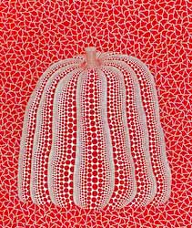 草間さんは1979年頃から版画制作を始め、ドットと編目模様で様々なイメージを版画にしてきました。現在彼女の看板となっている南瓜をはじめとして、花、ぶどう、ひまわり、果物などの植物や、靴、帽子、ドレス、ハンドバッグなどの衣服関連、また、金魚、蝶、魚、かたつむり、たつのおとしごなどの生物などの多様な具象イメージが制作されています。