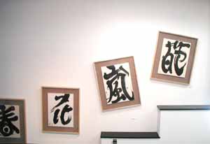 しかし、「書」で、しかも1字の作品を並べるとき、前述のような考え方はあまり有効ではありません。そこで考えたのが、物語を作ることでした。文字には意味があるのでそれを最大限に有効にしようというわけです。春、花、嵐、葩、花、華、花変化。こう並べてみるともうおわかりでしょう。「春」に「花」が咲き、きままな「嵐」で花が散って「葩(はなびら)」に変容。かすれた字の「花」と最もはなやかな見える「華」の「花変化」、というわけです。単なるこじつけのようなものですが、意味を考慮しない全くバラバラな配置より見やすいのではと思っています。