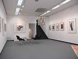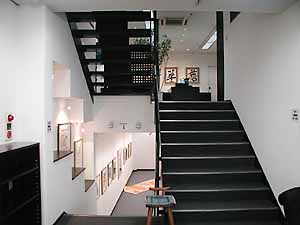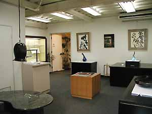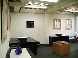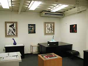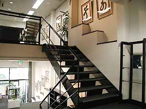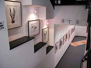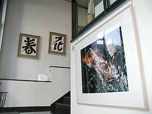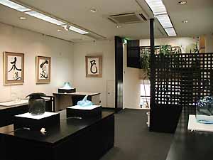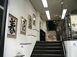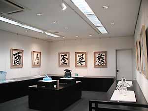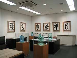拳の木の横を通って、ドアから入った正面の展示壁。